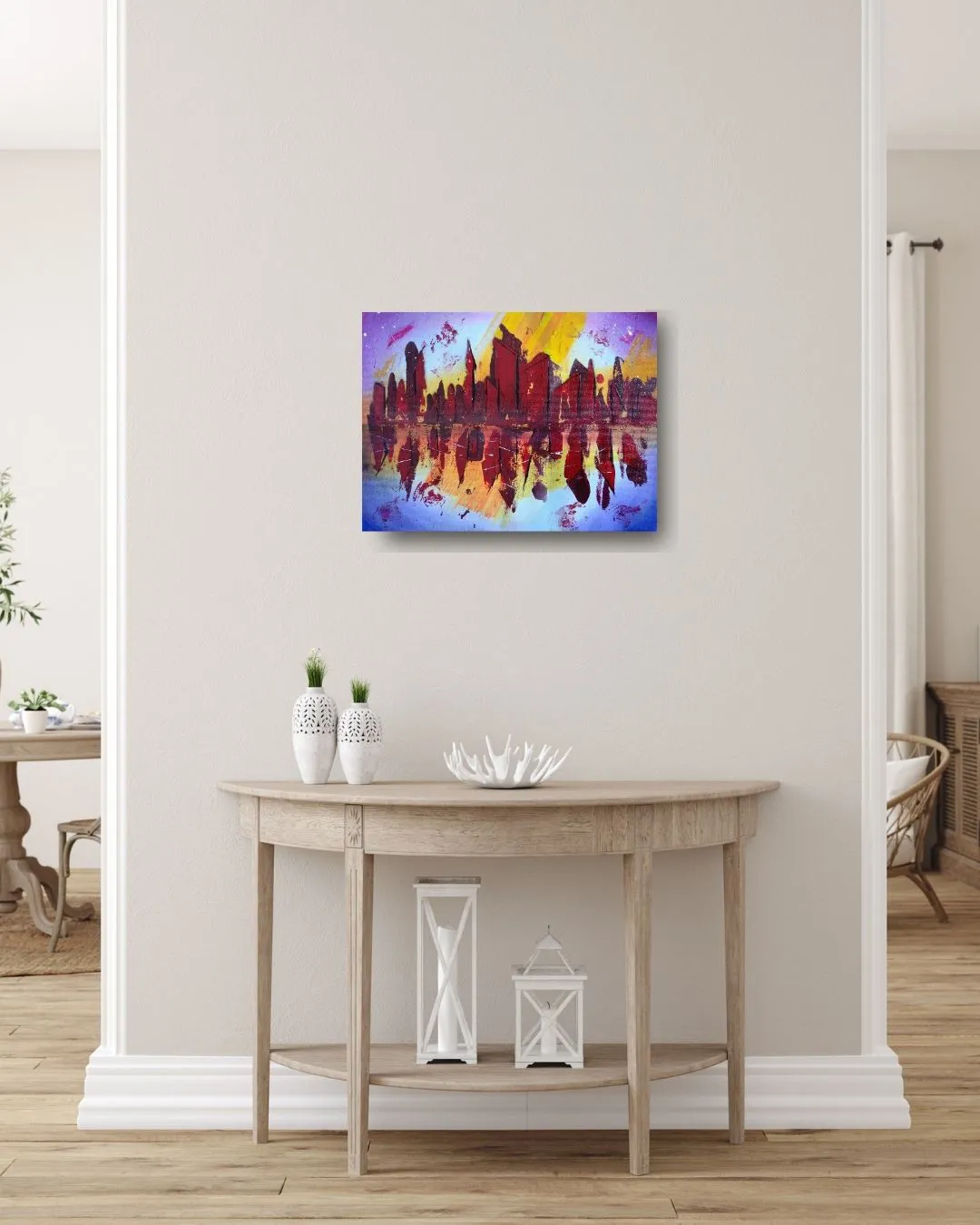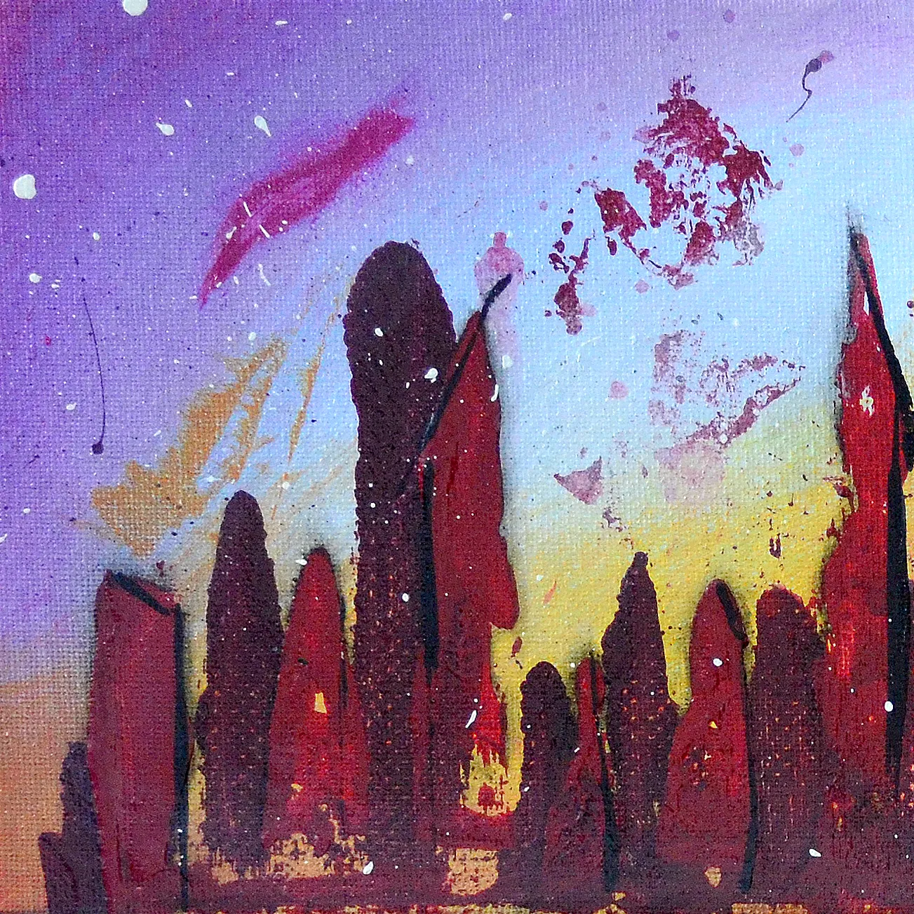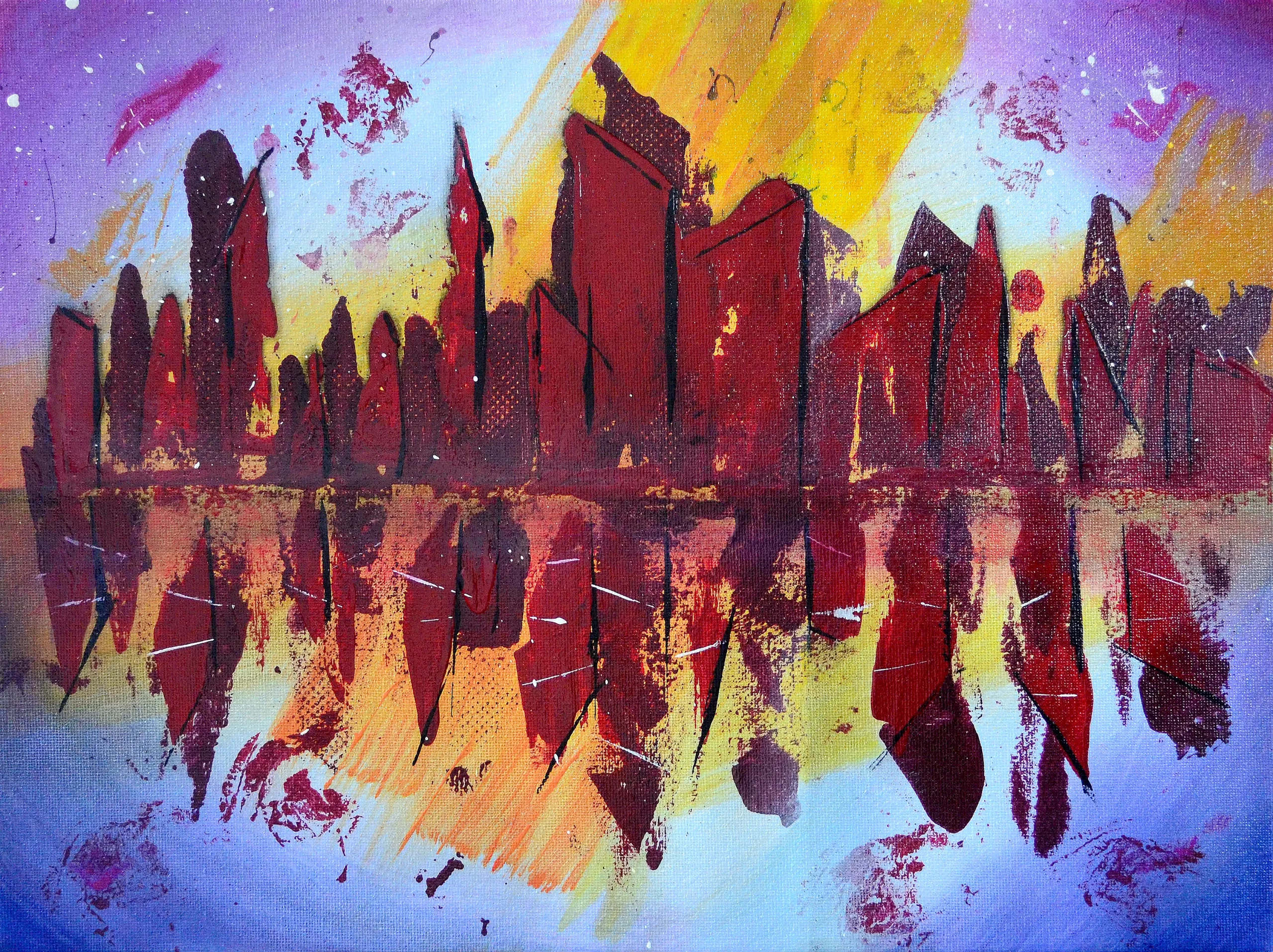 Céphée évoque la constellation du roi d'Éthiopie : une cité abstraite surgit entre ciel et eau, ses formes verticales et sombres se reflétant dans un miroir embrasé de rouge, d'ocre et de violet. Le contraste entre l'éclat solaire du fond jaune et la profondeur cramoisie des silhouettes confère à ce tableau une intensité lumineuse et une présence presque cosmique.
